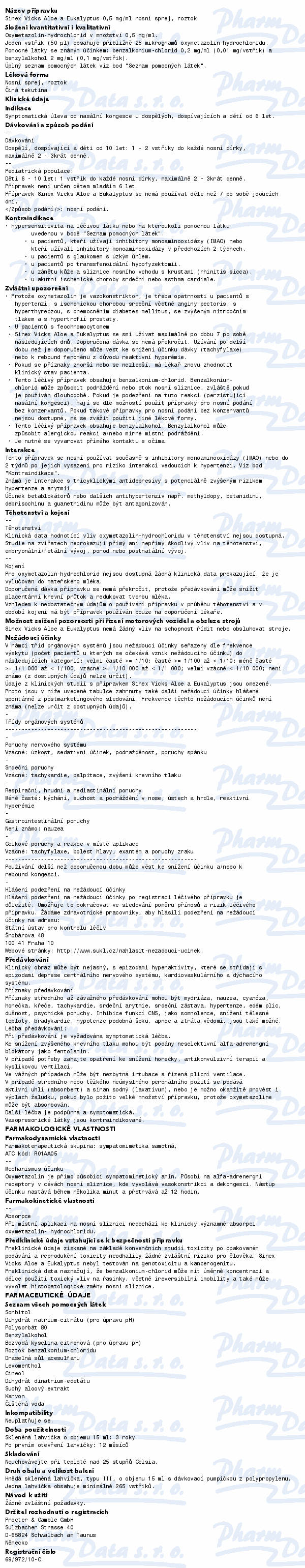 Sinex Vicks Aloe a Eukalyptus, nosní sprej se používá k místní úlevě od příznaků ucpaného nosu spojeného s rýmou nebo zánětem nosních dutin. Účinek přípravku nastupuje za několik minut a přetrvává 6-8 hodin. Čtěte pozorně příbalový leták.
