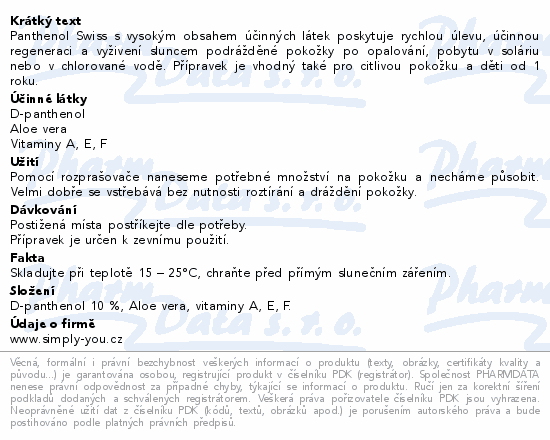 Panthenol Swiss s vysokým obsahem účinných látek poskytuje rychlou úlevu, účinnou regeneraci a vyživení sluncem podrážděné pokožky po opalování, pobytu v soláriu nebo v chlorované vodě. Přípravek je vhodný také pro citlivou pokožku a děti od 1 roku.