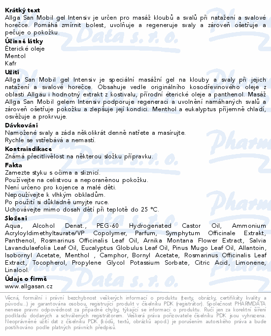 Allga San Mobil gel Intensiv je určen pro masáž kloubů a svalů při natažení a svalové horečce. Pomáhá zmírnit bolest, uvolňuje a regeneruje svaly a zároveň ošetřuje a pečuje o pokožku.