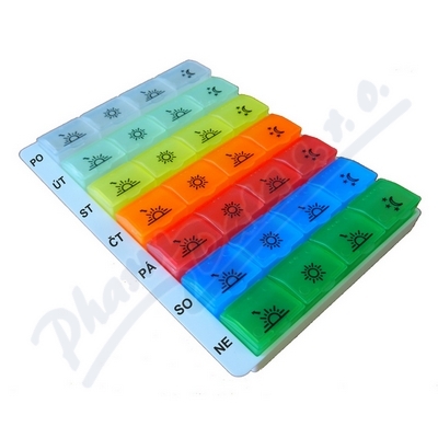 Slouží k přehlednému uspořádání a spolehlivému dávkování léků či potravinových doplňků doma i na cestách. Je označen jednoduchými symboly zobrazujícími denní dobu. Dostupný v několika barevných provedeních.Velikost dávkovače 175 x 125 x 20mm (d x š x v).