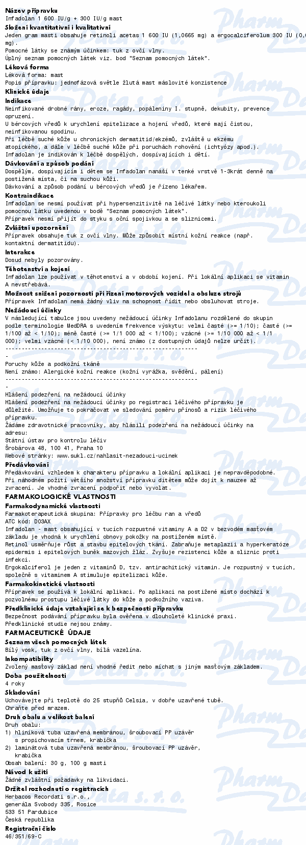 Infadolan se používá na neinfikované drobné rány, oděrky, popáleniny I. stupně, na suchou popraskanou kůži, na trhliny v kožních rýhách. Infadolan je mast pro zevní použití obsahující vitamin A a vitamin D2. Čtěte pozorně příbalový leták.