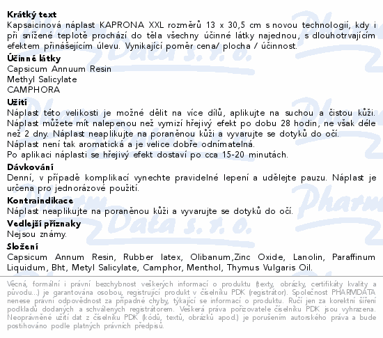 Kapsaicinová náplast KAPRONA XXL rozměrů 13 x 30,5 cm s novou technologií, kdy i při snížené teplotě prochází do těla všechny účinné látky najednou, s dlouhotrvajícím efektem přinášejícím úlevu. Vynikající poměr cena/ plocha / účinnost.