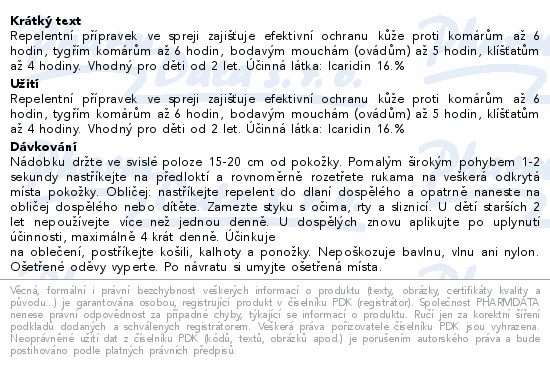 Repelentní přípravek ve spreji zajišťuje efektivní ochranu kůže proti komárům až 6 hodin, tygřím komárům až 6 hodin, bodavým mouchám (ovádům) až 5 hodin, klíšťatům až 4 hodiny. Vhodný pro děti od 2 let. Účinná látka: Icaridin 16.%