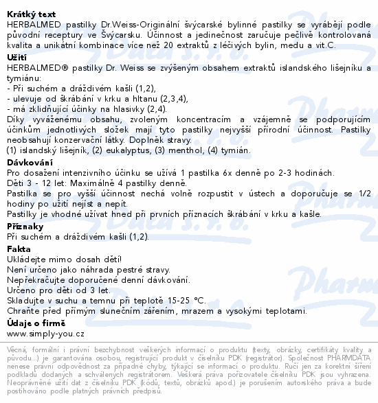 HERBALMED pastilky Dr.Weiss-Originální švýcarské bylinné pastilky se vyrábějí podle původní receptury ve Švýcarsku. Účinnost a jedinečnost zaručuje pečlivě kontrolovaná kvalita a unikátní kombinace více než 20 extraktů z léčivých bylin, medu a vit.C.