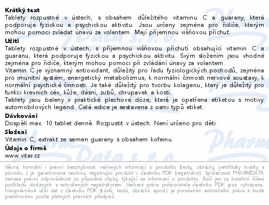 Tablety rozpustné v ústech, s obsahem důležitého vitaminu C a guarany, která podporuje fyzickou a psychickou aktivitu. Jsou určeny zejména pro řidiče, kterým mohou pomoci zvládat únavu za volantem. Mají příjemnou višňovou příchuť.