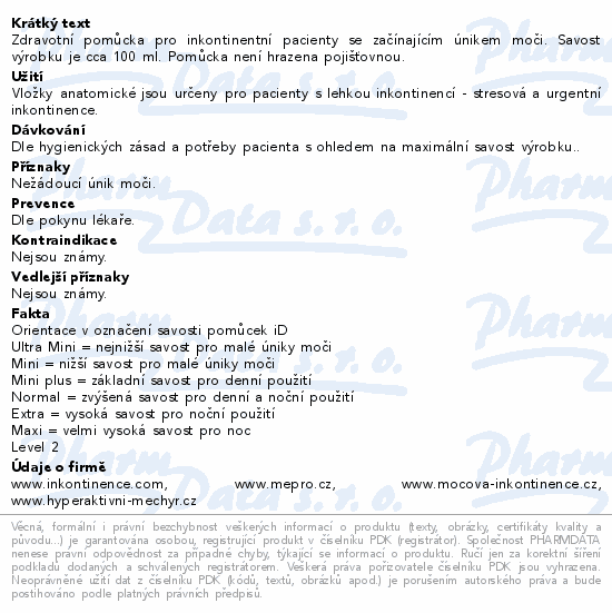 Zdravotní pomůcka pro inkontinentní pacienty se začínajícím únikem moči. Savost výrobku je cca 100 ml. Pomůcka není hrazena pojišťovnou.