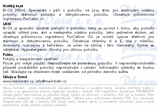 Bi-Oil 200ml: Specialista v péči o pokožku: na jizvy, strie, pro sjednocení odstínu pokožky, stárnoucí pokožku a dehydrovanou pokožku. Obsahuje průlomovou ingredienci PurCellin oil.