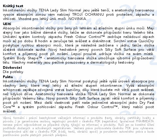 Inkontinenční vložky TENA Lady Slim Normal jsou ještě tenčí, s anatomicky tvarovanou vysoce absorpční zónou vám nabízejí TROJÍ OCHRANU proti protečení, zápachu a vlhkosti. Vhodné pro lehký únik moči. NOVINKA.
