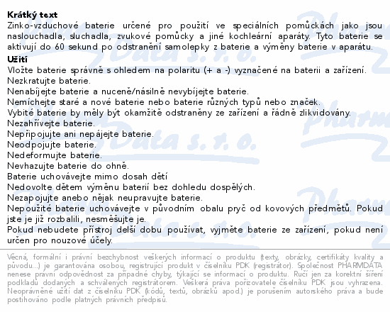 Zinko-vzduchové baterie určené pro použití ve speciálních pomůckách jako jsou naslouchadla, sluchadla, zvukové pomůcky a jiné kochleární aparáty. Tyto baterie se aktivují do 60 sekund po odstranění samolepky z baterie a výměny baterie v aparátu.