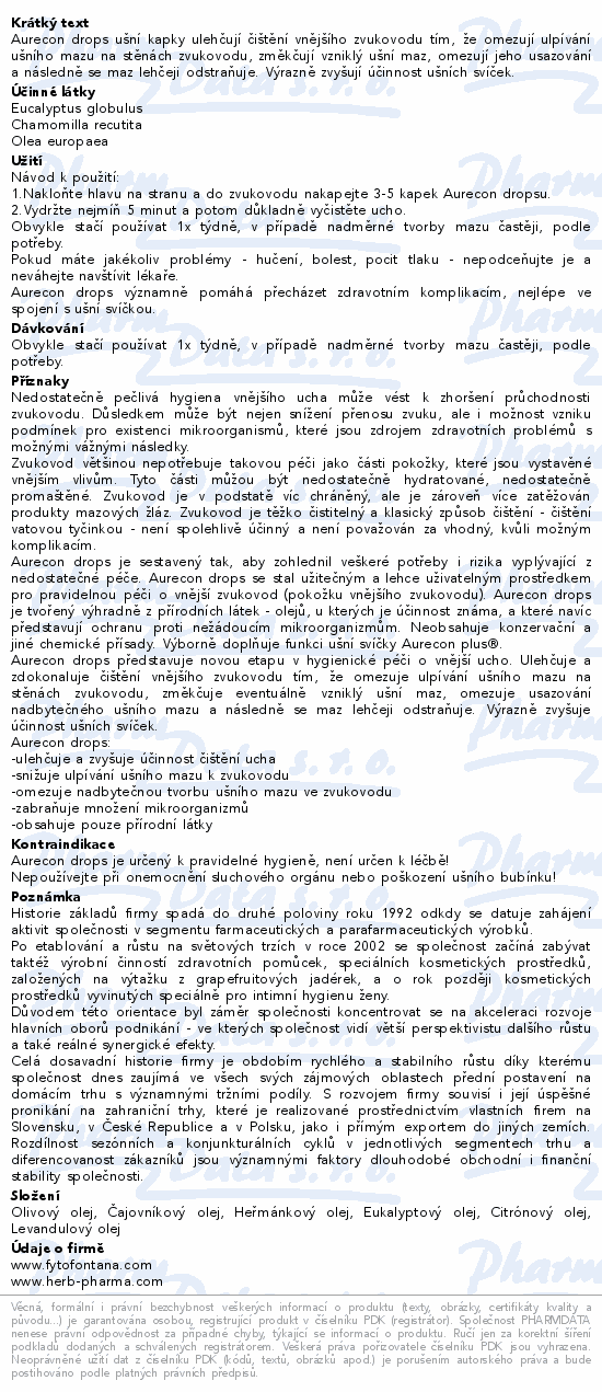Aurecon drops ušní kapky ulehčují čištění vnějšího zvukovodu tím, že omezují ulpívání ušního mazu na stěnách zvukovodu, změkčují vzniklý ušní maz, omezují jeho usazování a následně se maz lehčeji odstraňuje. Výrazně zvyšují účinnost ušních svíček.