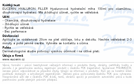 EUCERIN HYALURON FILLER Hyaluronová hydratační mlha 150ml pro okamžitou, dlouhotrvající hydrataci. Má zklidňující účinek, rychle se vstřebává.
