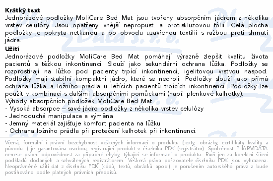 Jednorázové podložky MoliCare Bed Mat jsou tvořeny absorpčním jádrem z několika vrstev celulózy. Jsou opatřeny vnější nepropust. a protiskluzovou fólií. Celá plocha podložky je pokryta netkanou a po obvodu uzavřenou textilií s ražbou proti shrnutí jádra.