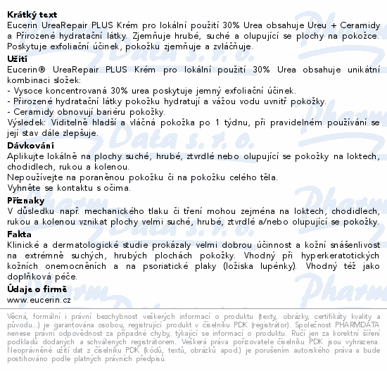 Eucerin UreaRepair PLUS Krém pro lokální použití 30% Urea obsahuje Ureu + Ceramidy a Přirozené hydratační látky. Zjemňuje hrubé, suché a olupující se plochy na pokožce. Poskytuje exfoliační účinek, pokožku zjemňuje a zvláčňuje.