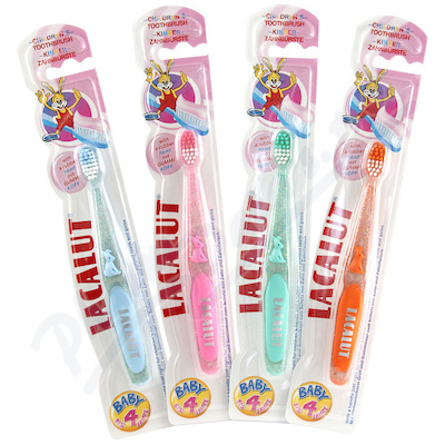 Lacalut dětský zubní kartáček s pogumovanou hlavicí pro ochranu zubů a protiskluzovou opěrou na palec pro děti do 4 let.