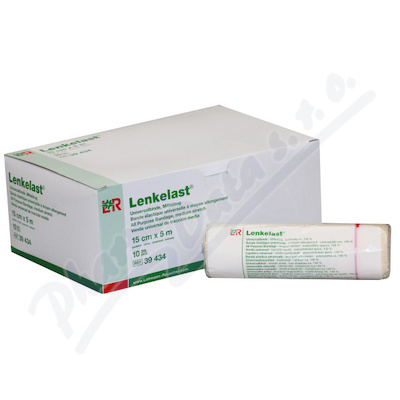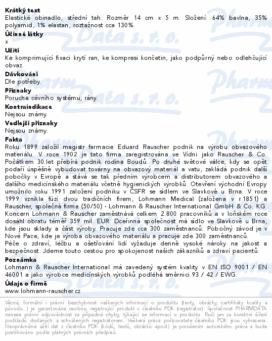 Elastické obinadlo, střední tah. Rozměr 14 cm x 5 m. Složení: 64% bavlna, 35% polyamid, 1% elastan, roztažnost cca 130%.