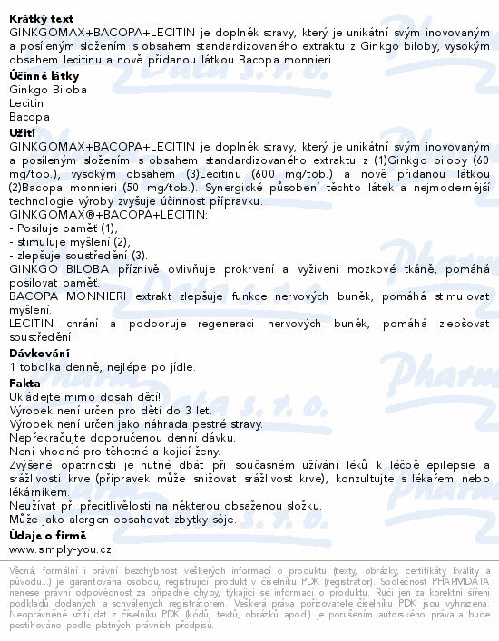 GINKGOMAX+BACOPA+LECITIN je doplněk stravy, který je unikátní svým inovovaným a posíleným složením s obsahem standardizovaného extraktu z Ginkgo biloby, vysokým obsahem lecitinu a nově přidanou látkou Bacopa monnieri.