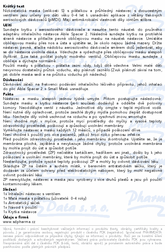 Nízkostatická maska (velikosti S) s píšťalkou a průhledný nástavec s dvoucestným ventilem jsou určeny pro děti věku 0-4 let k usnadnění aplikace z většiny tlakových aerosolových dávkovačů (pMDI). Mají antimikrobiální vlastnosti díky iontům stříbra.