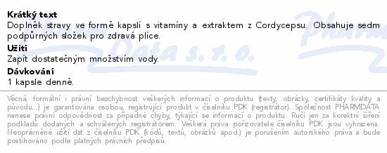 Doplněk stravy ve formě kapslí s vitamíny a extraktem z Cordycepsu. Obsahuje sedm podpůrných složek pro zdravá plíce.