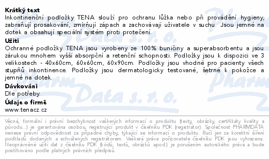 Inkontinenční podložky TENA slouží pro ochranu lůžka nebo při provádění hygieny, zabraňují prosakování, zmírňují zápach a zachovávají uživatele v suchu. Jsou jemné na dotek a obsahují speciální systém proti protečení.