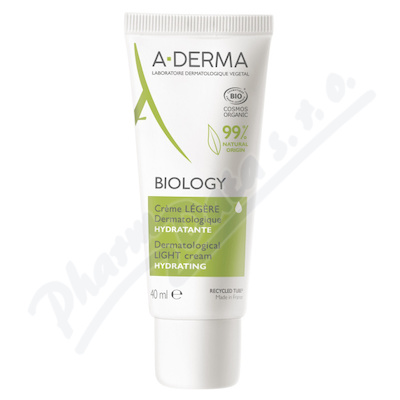 A-DERMA BIOLOGY Dermatologický lehký hydratační krém poskytuje 24h hydrataci normální až smíšené pleti. Obsahuje aktivní látky, které pleti zajišťují optimální snášenlivost a navrací jí rovnováhu. Bez parfemace.