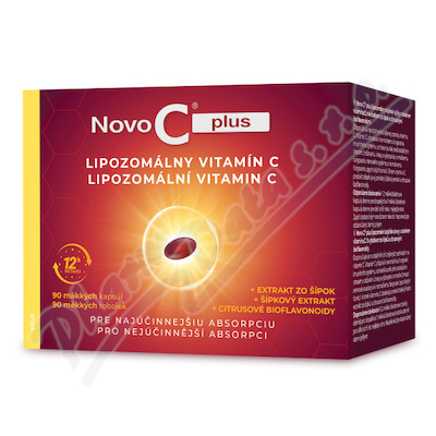 Originální lipozomální vitamin C Novo C Plus s obsahem šípků a bioflavonoidy ve formě želatinových tobolek s vysokým vstřebáváním, od 6 let.