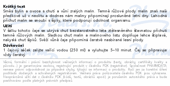Směs bylin a ovoce s chutí a vůní zralých malin. Temně růžové plody malin znali naši předkové už v neolitu a dodnes nám maliny připomínají prosluněné letní dny. Lahodná příchuť malin se snoubí s šípky, které podporují odolnost organismu.
