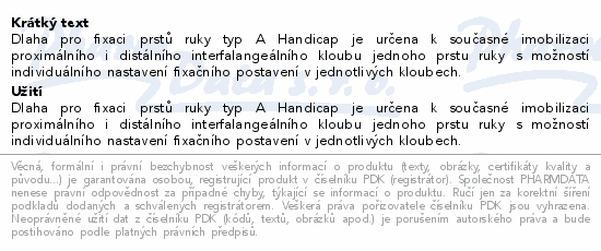 Dlaha pro fixaci prstů ruky typ A Handicap je určena k současné imobilizaci proximálního i distálního interfalangeálního kloubu jednoho prstu ruky s možností individuálního nastavení fixačního postavení v jednotlivých kloubech.