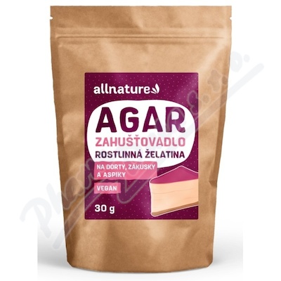 Průhledná rostlinná želatina bez chuti a zápachu. Získává se z červených mořských řas. Je vhodná k přípravě dortů, zákusků nebo aspiku. Agar má výbornou želírující schopnost a drží si tvar pří krájení i při vyšších teplotách.