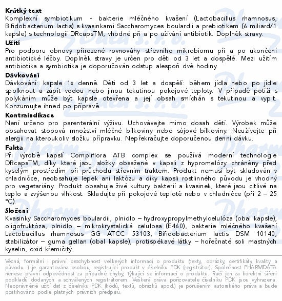 Komplexní symbiotikum - bakterie mléčného kvašení (Lactobacillus rhamnosus, Bifidobacterium lactis) s kvasinkami Saccharomyces boulardii a prebiotikem (6 miliard/1 kapsle) s technologií DRcapsTM, vhodné při a po užívání antibiotik. Doplněk stravy.