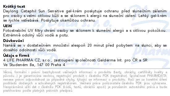 Daylong Cetaphil Sun Sensitive gel-krém poskytuje ochranu před slunečním zářením pro osoby s velmi citlivou kůží a se sklonem k alergii na sluneční záření. Lehký gel-krém se rychle vstřebává. Poskytuje okamžitou ochranu.