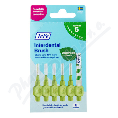 TePe Original mezizubní kartáčky 0,8 mm, zelené 6 ks. Drátek je potažený plastem pro maximální ochranu dásní a citlivých zubních krčků. Vysoce odolné vůči zlomení. Plochá rukojeť pro pohodlné a přesné čištění. Baleno v papírové uzavíratelné krabičce.