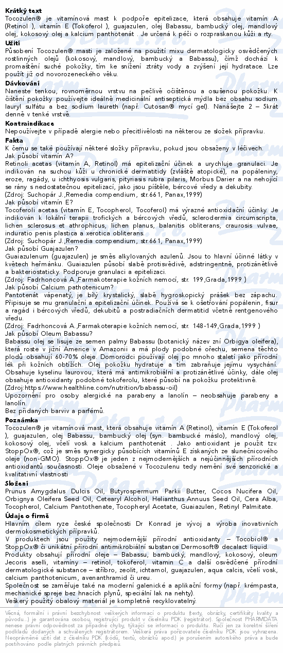 Tocozulen® je vitamínová mast k podpoře epitelizace, která obsahuje vitamín A (Retinol ), vitamín E (Tokoferol ), guajazulen, olej Babassu, bambucký olej, mandlový olej, kokosový olej a kalcium panthotenát . Je určená k péči o rozpraskanou kůži a rty.