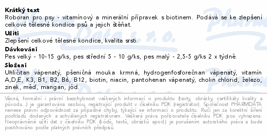 Roboran pro psy - vitamínový a minerální přípravek s biotinem. Podává se ke zlepšení celkové tělesné kondice psů a jejich štěňat.