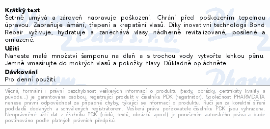 Šetrně umývá a zároveň napravuje poškození. Chrání před poškozením tepelnou úpravou. Zabraňuje lámání, třepení a krepatění vlasů. Díky inovativní technologii Bond Repair vyživuje, hydratuje a zanechává vlasy nádherně revitalizované, posílené a omlazené.