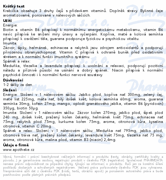 Krabička obsahuje 3 druhy čajů s přídavkem vitaminů. Doplněk stravy. Bylinné čaje aromatizované, porcované v nálevových sáčcích.
