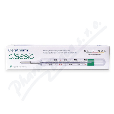 Teploměr skleněný bezrtuťový Geratherm měří teplotu těla přesně a spolehlivě. Má doživotní záruku přesnosti (0,10-0,15°C). Je 100% hygienický. Přiložené sklepávadlo umožní lepší sklepávání galia. Originál - vyráběný v Německu.