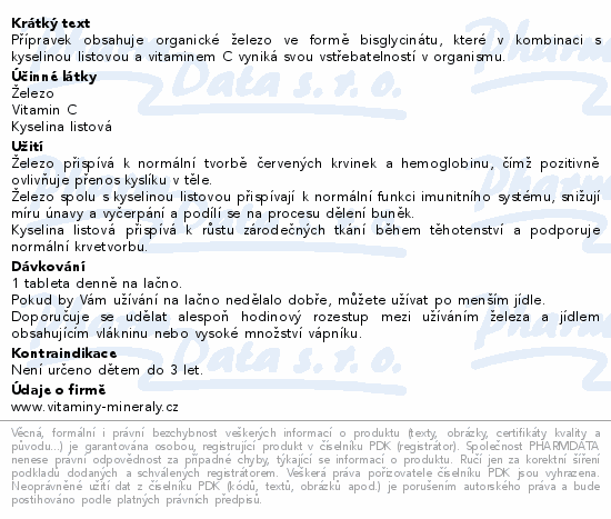 Přípravek obsahuje organické železo ve formě bisglycinátu, které v kombinaci s kyselinou listovou a vitaminem C vyniká svou vstřebatelností v organismu.