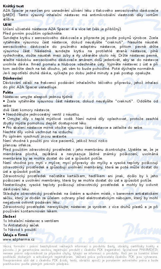 A2A Spacer je navržen pro usnadnění užívání léku z tlakového aerosolového dávkovače (pMDI). Tento výsuvný inhalační nástavec má antimikrobiální vlastnosti díky iontům stříbra.