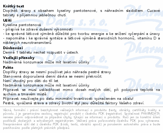Doplněk stravy s obsahem kyseliny pantotenové, s náhradním sladidlem. Cucavé tablety s příjemnou jablečnou chutí.