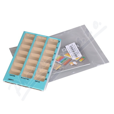 Slouží k přehlednému uspořádání a spolehlivému dávkování léků či potravinových doplňků doma i na cestách. Je označen jednoduchými popisky zobrazujícími denní dobu. Dostupný v několika barevných provedeních. Velikost dávkovače 136 x 81 x 25 mm (d x š x v)