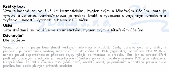 Vata skládaná se používá ke kosmetickým, hygienickým a lékařským účelům. Vata je vyrobena ze směsi bavlna/viskóza, je měkká, kvalitně vyčesaná s příjemným omakem a zvýšenou savostí. Výrobek je balen v PE sáčku.