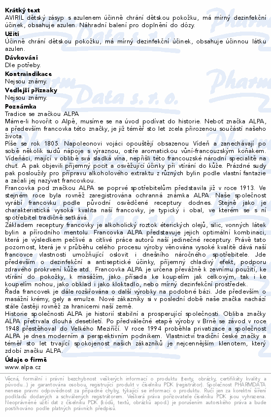AVIRIL dětský zásyp s azulenem účinně chrání dětskou pokožku, má mírný dezinfekční účinek, obsahuje azulen. Náhradní balení pro doplnění do dózy.