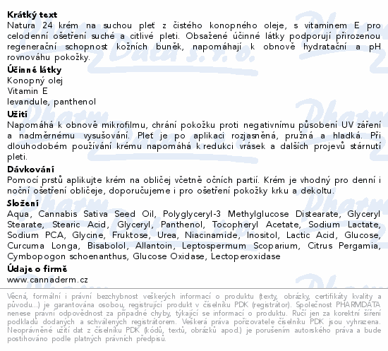 Natura 24 krém na suchou pleť z čistého konopného oleje, s vitaminem E pro celodenní ošetření suché a citlivé pleti. Obsažené účinné látky podporují přirozenou regenerační schopnost kožních buněk, napomáhají k obnově hydratační a pH rovnováhu pokožky.
