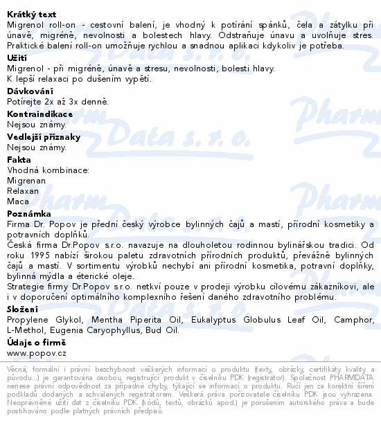 Migrenol roll-on - cestovní balení, je vhodný k potírání spánků, čela a zátylku při únavě, migréně, nevolnosti a bolestech hlavy. Odstraňuje únavu a uvolňuje stres. Praktické balení roll-on umožňuje rychlou a snadnou aplikaci kdykoliv je potřeba.